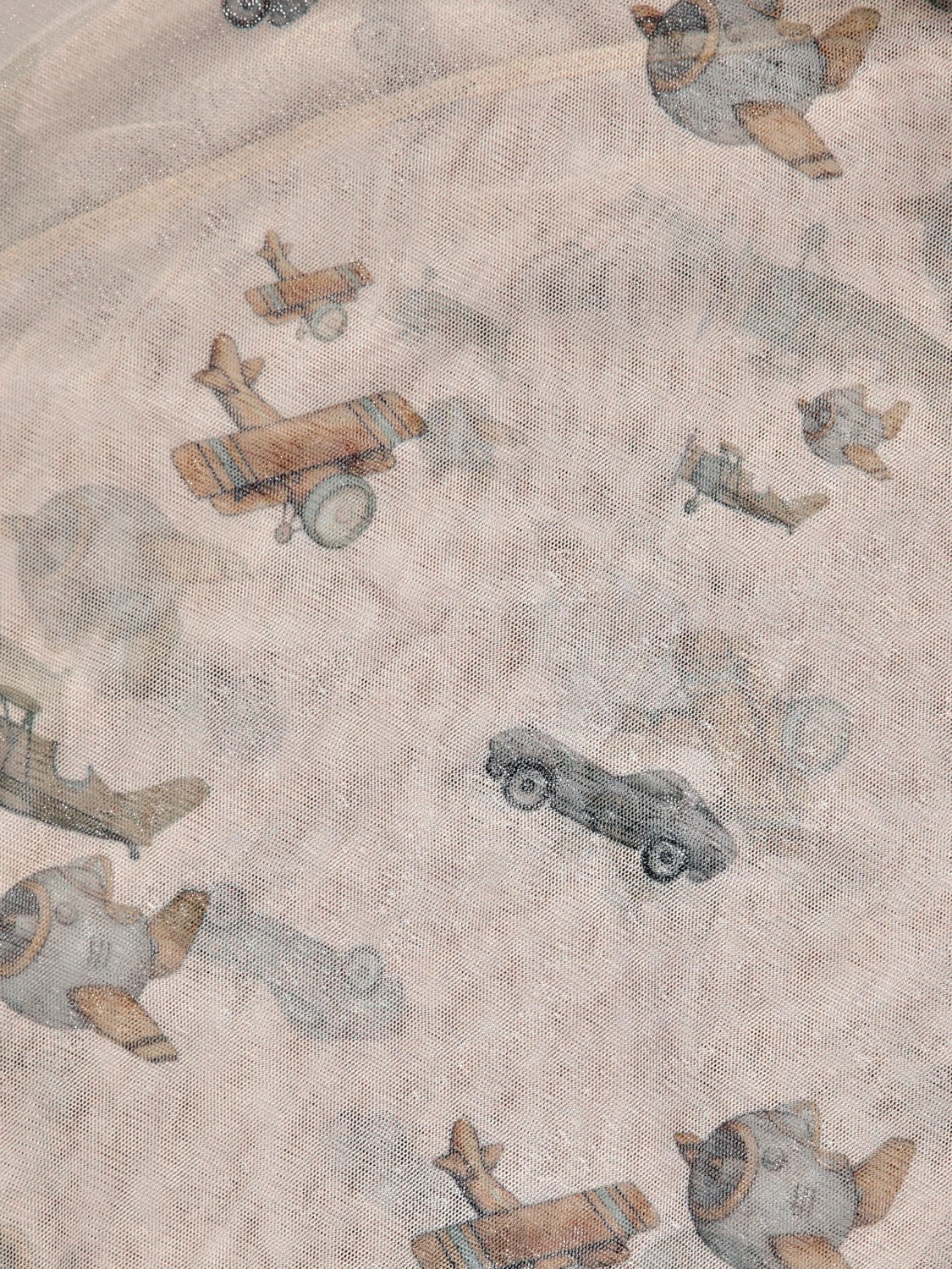 Name It hyttysverkko vaunuihin, kuvituksena lentokoneita ja autoja beigellä pohjalla.