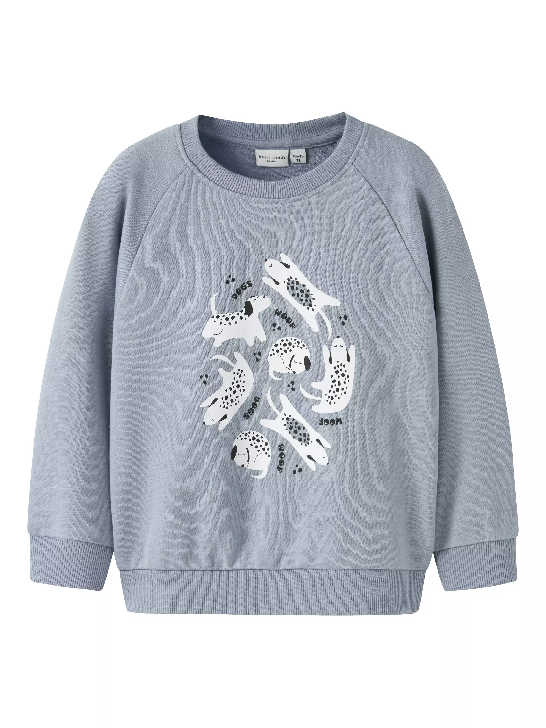 Name it lasten vaaleansininen collegepaita jossa hauskoja musta-valkoisia koiria.