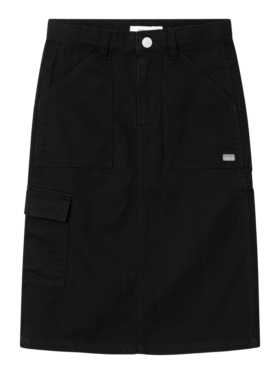 Midi-mittainen farkkuhame. Taskut edessä ja takana, lisäksi yksi reisitasku. Vyötäröllä kiristysmahdollisuus, sekä vyölenkit.