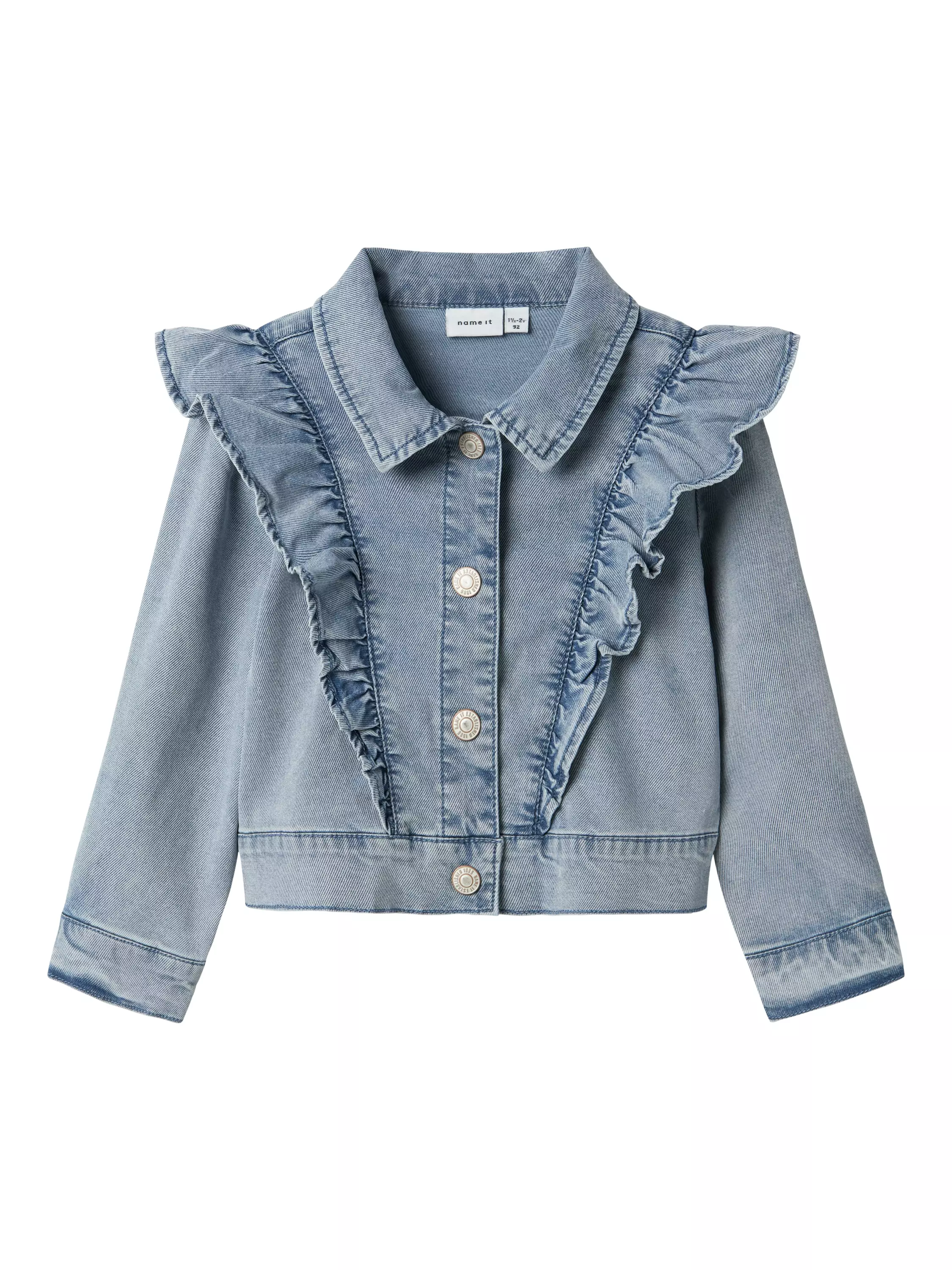 Upea frillakoristeltu paitatakki neppareilla ja kulutetulla pesulla. Ohutta ja pehmeää farkkumaista kangasta.