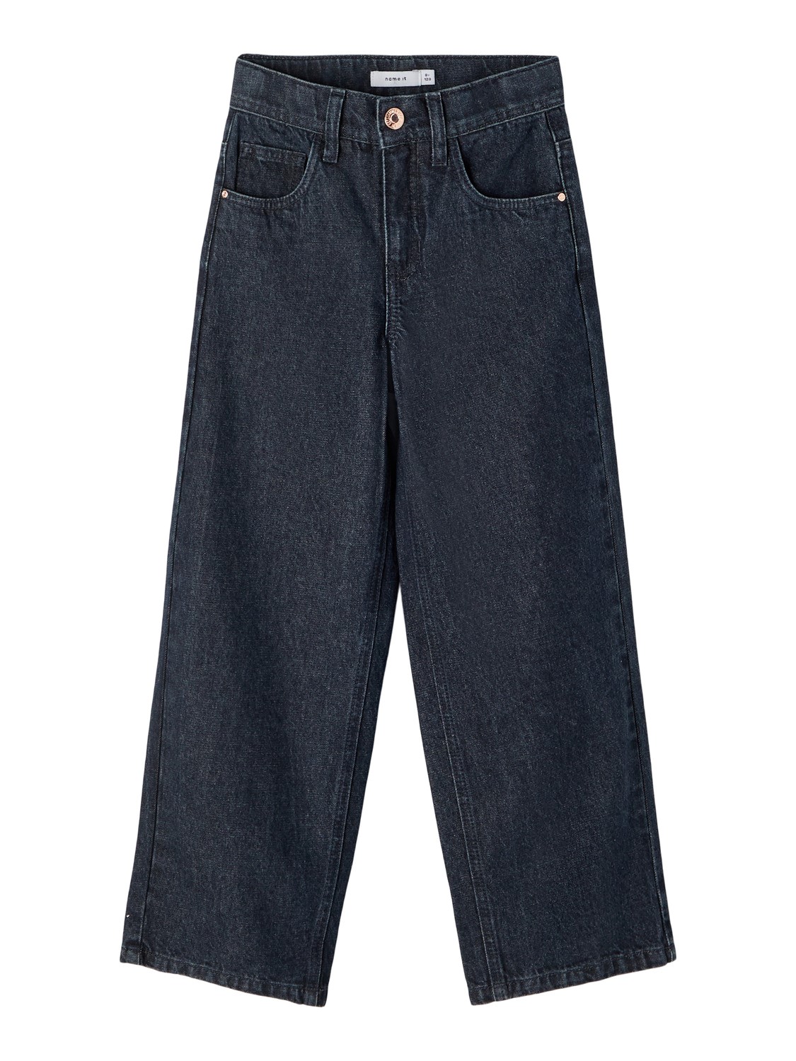 Lasten leveät tummansiniset farkut, joissa kuminauha-nappikiristys vyötäröllä. 100% puuvillaa