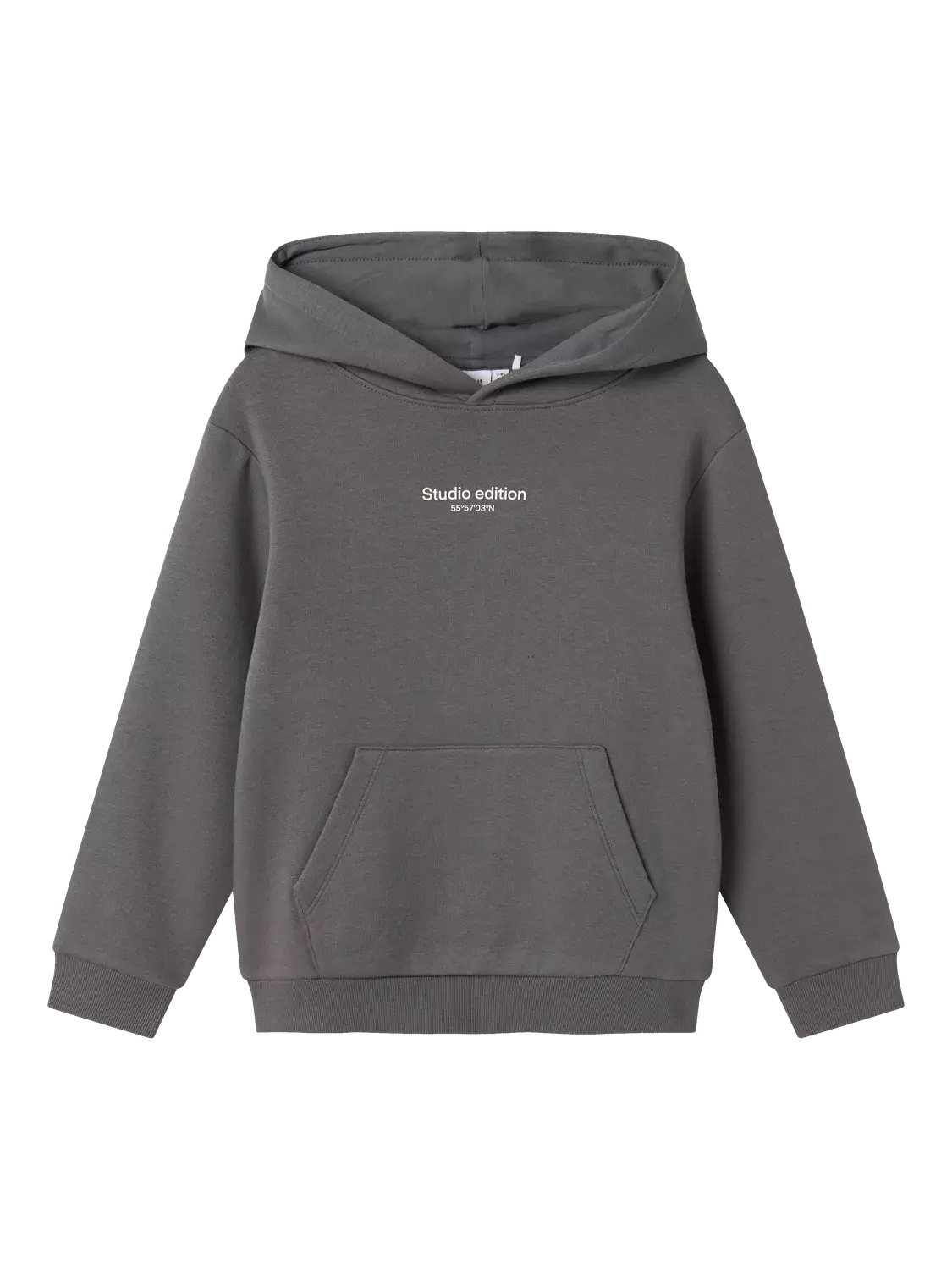 Name it huppari, tummanharmaa Name it tummanharmaa lasten huppari tekstillä. Materiaali: 70% puuvilla, 30% polyesteri