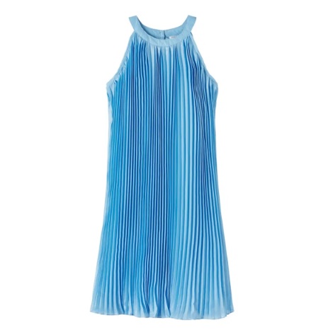 Lasten hihaton A-linjainen mekko, kauniin sinisen sävyistä pliseerattua kangasta.