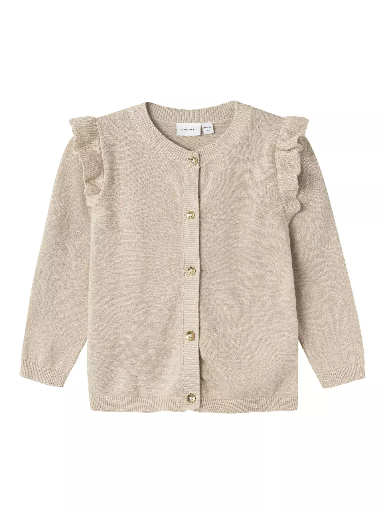 Name it lasten kultainen, kimaltava neuletakki. 74% Cotton, 18% Polyester, 8% Metallic Fibres