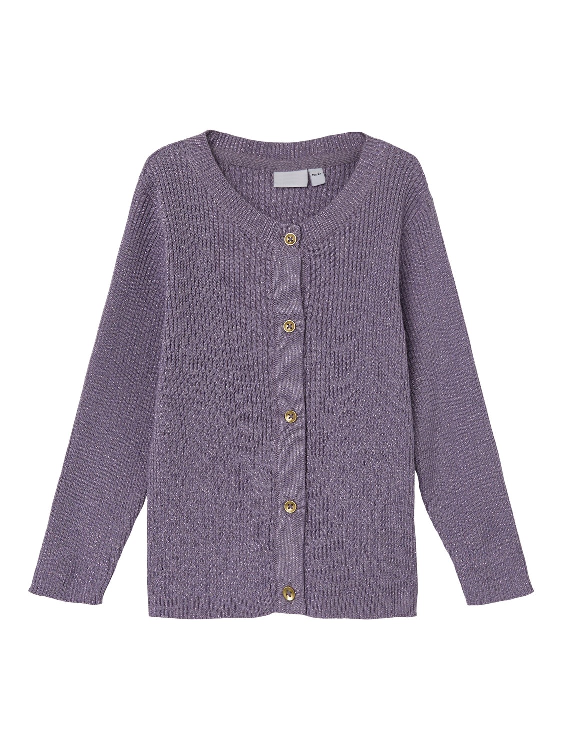 Kimaltava laventelin sävyinen napitettava neuletakki. 48% puuvillaa, 32% viskoosia, 14% polyesteria, 6% metallikuitua