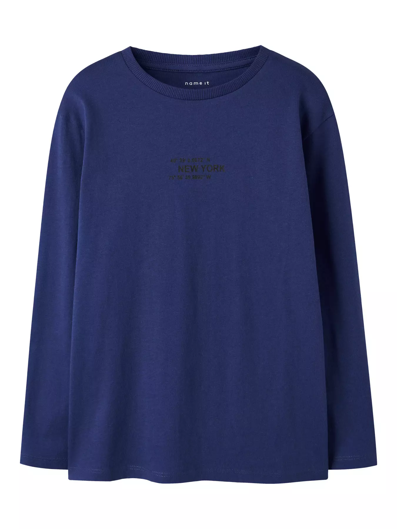 Lasten tummansininen trikoopaita. Edessä teksti "New York" ja takana musta-valkoisia kaupunkiaiheisia painatuksia. 80% luomupuuvillaa, 20% kierrätettyä puuvillaa