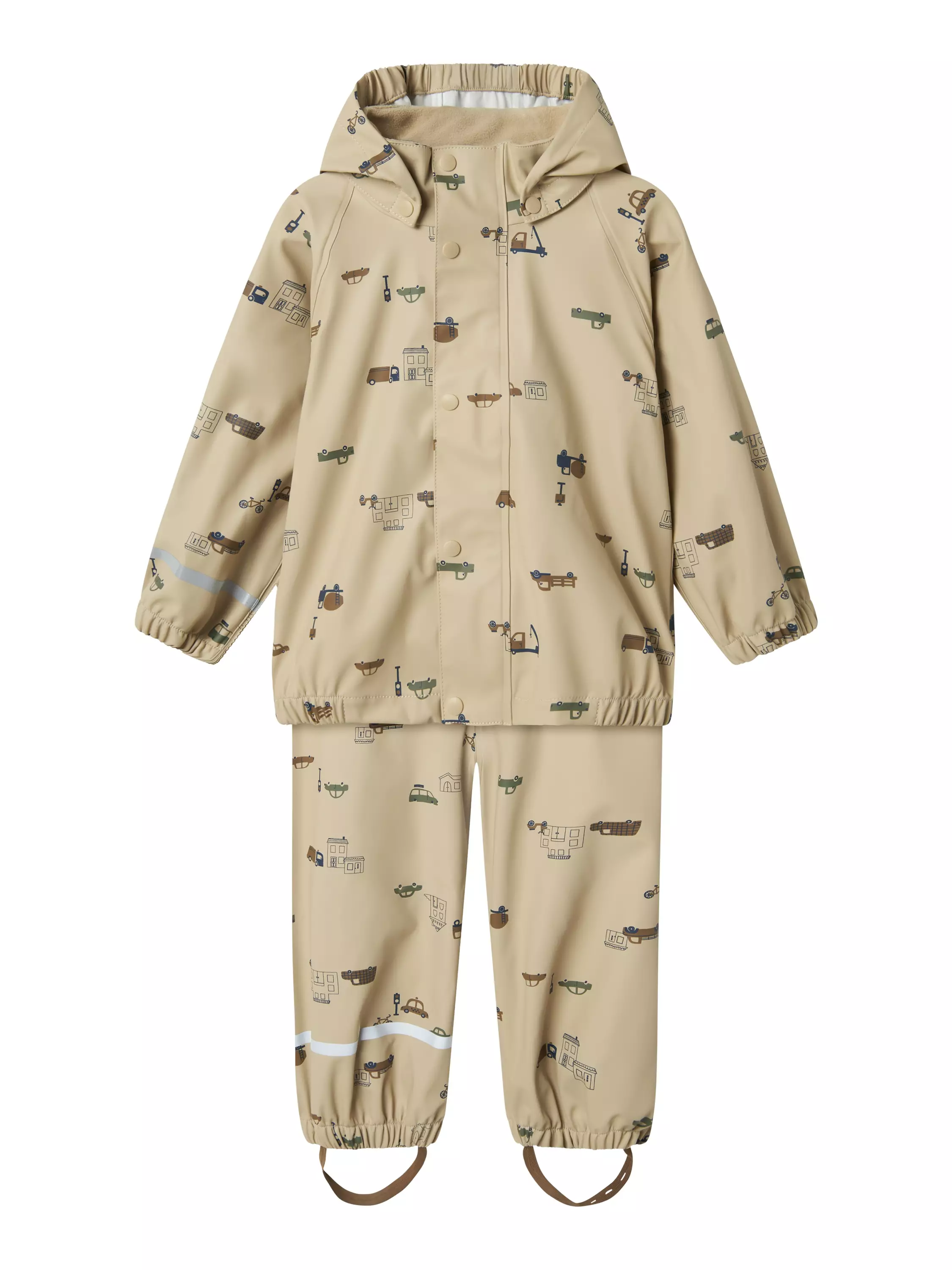 Name it lasten vuoriton sadeasu jossa sadetakki ja korkeavyötäröiset sadehousut henkseleillä. 100% Polyester- Polyurethane coated NMMDRY10 RAIN SET AOP, White Pepper