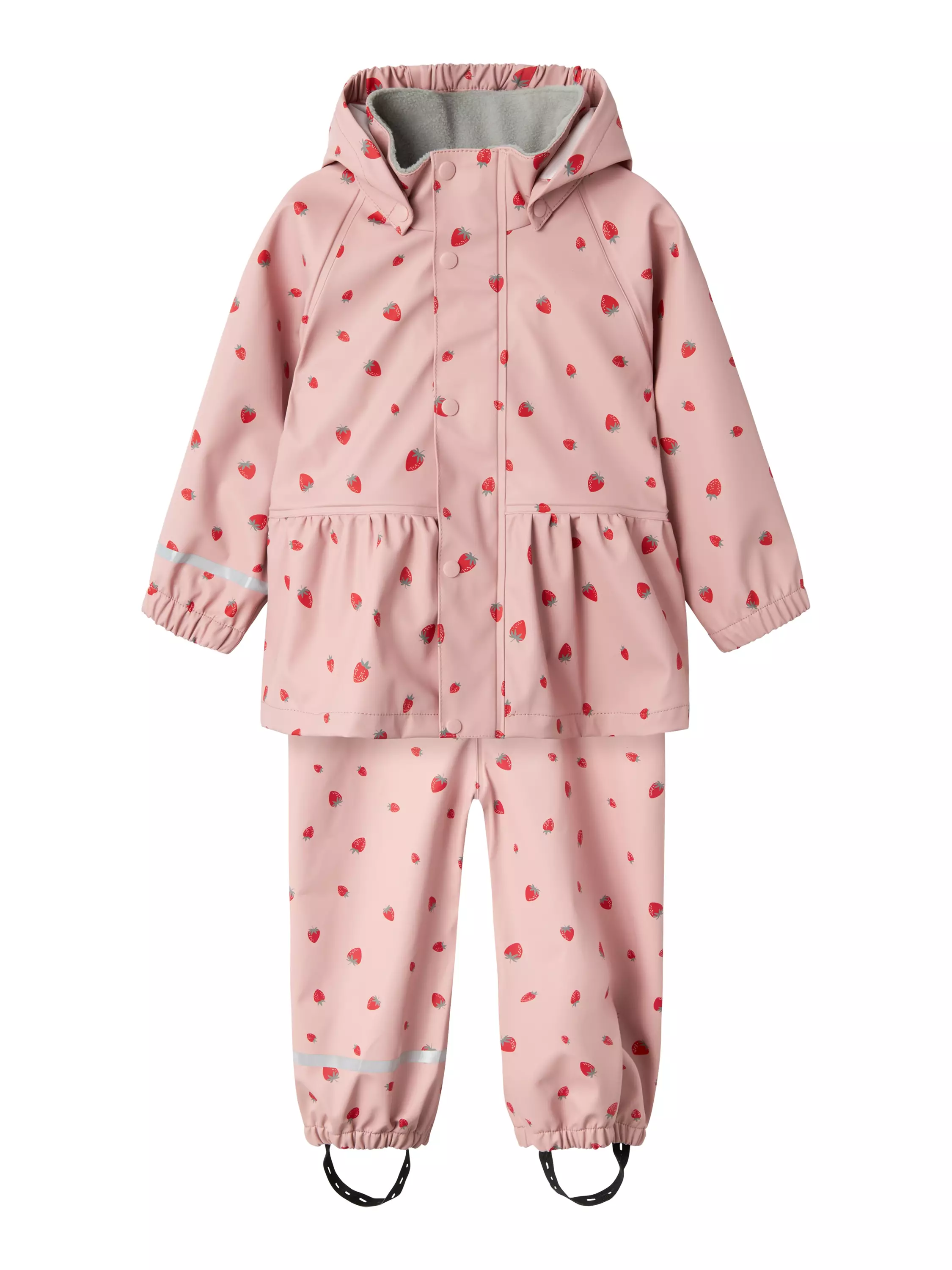 Name it lasten vuoriton sadeasu jossa sadetakki ja korkeavyötäröiset sadehousut henkseleillä. 100% Polyester- Polyurethane coated NMFDRY10 RAIN SET AOP, Pale Mauve