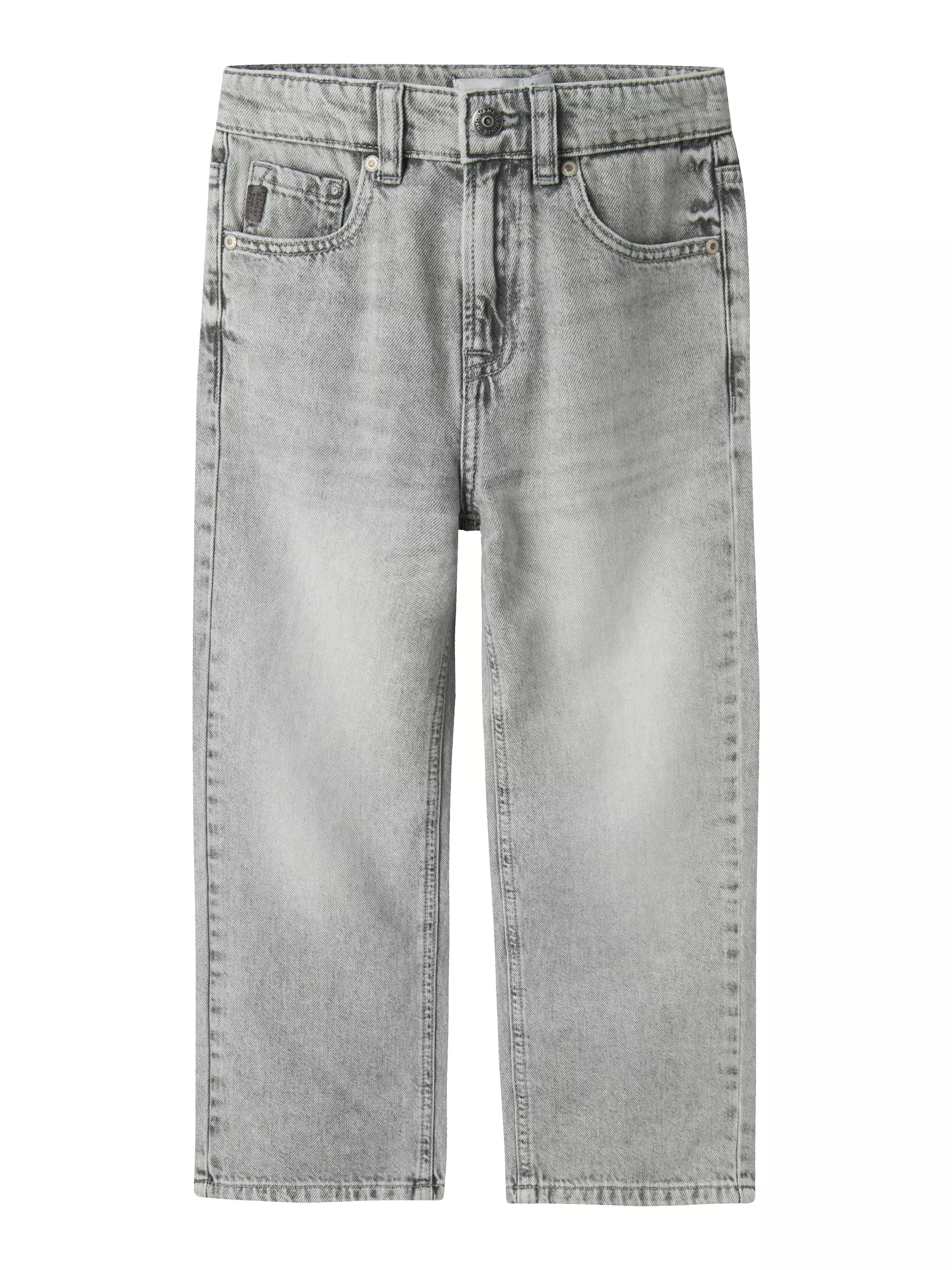 Lasten suoralahkeiset meleeratun harmaat farkut. Kuminauha-nappikiristys vyötäröllä. 50% luomupuuvillaa, 50% puuvillaa