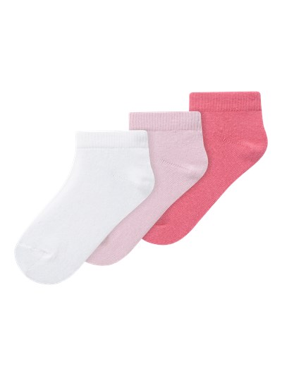 Lyhytvartiset sukat, pakkauksessa 3 paria. Valkoiset, vaaleanpunaiset ja pinkit. 77% luomupuuvillaa, 21% nailonia, 2% elastaania