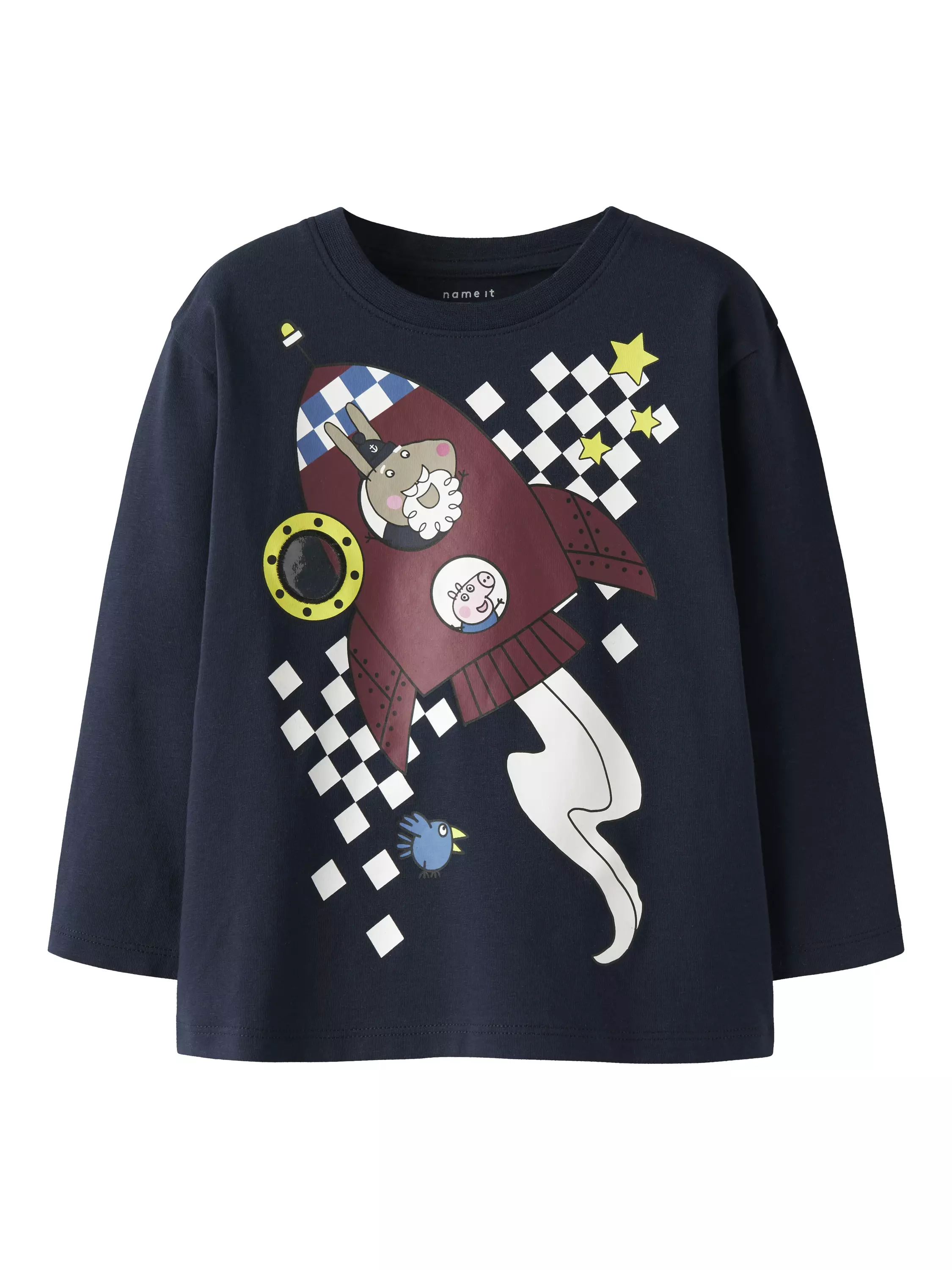 Name it lasten Pipsa Possu paita. Edessä Jyri Possu/raketti painatus. 75% Cotton - Organic, 20% Cotton - Recycled, 5% Elastane