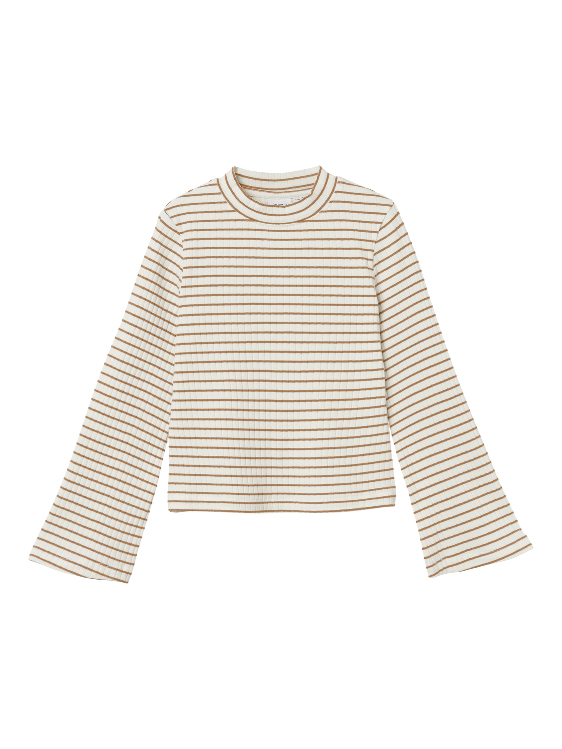 Lasten ihanan pehmeä ruskea-valkoraidallinen pitkähihainen trikoopaita hauskoilla levenevillä hihoilla!