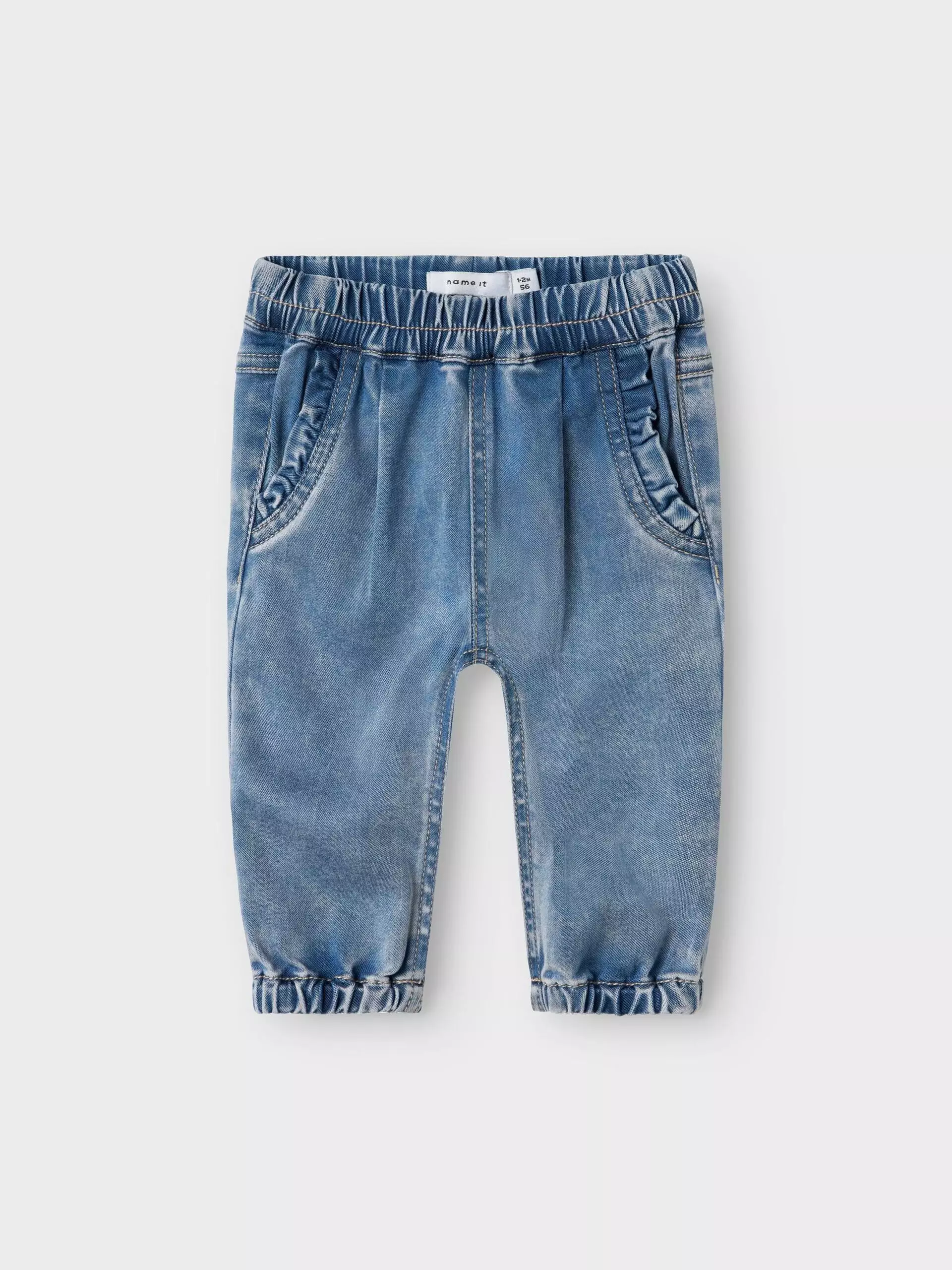 Vauvan pehmeät ja joustavat farkut kauniilla röyhelötaskuilla. Vyötäröllä kuminauha-nappikiristys.