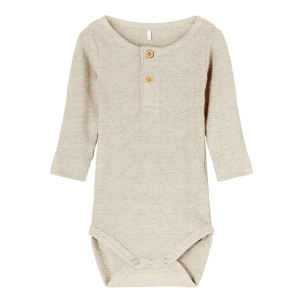 Name Itin ribbibody söpöillä vaarinpaita-tyylisillä koristenapeilla. 57% luomupuuvillaa, 38% modaalia, 5% elastaania