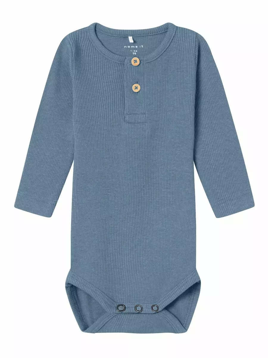 Name Itin ribbibody söpöillä vaarinpaita-tyylisillä koristenapeilla. 57% luomupuuvillaa, 38% modaalia, 5% elastaania