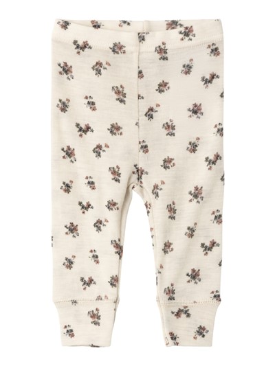 Name it vauvan ohuet villaiset pitkät alushousut / villalegginsit. Luonnovalkoisella pohjalla kukkakuviota. 100% merinovillaa, mulesing-free