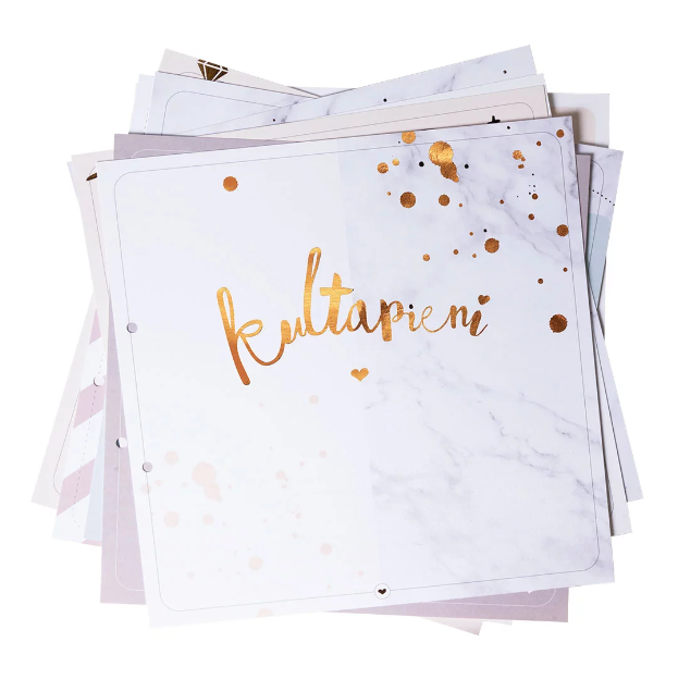 Sisältää: 20 laadukkaalle 300g paperille neliväripainettua sekä ruusukultafolioitua sivua mappirei’ityksellä