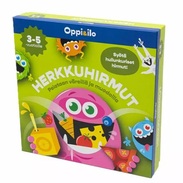 Herkkuhirmut ovat nälissään! Pyöritä kiekkoa ja syötä hirmulle oikea herkku. Kenen herkkuvarasto tyhjenee ensimmäisenä? Oppi&ilo Herkkuhirmut on kiva ja kehittävä lajittelupeli pienille lapsille. Pelin lomassa lapsi oppii värejä ja muotoja. Yhdessä pelaaminen opettaa lapselle oman vuoron odottamista, vuorovaikutustaitoja sekä voittamiseen ja häviämiseen liittyvien tunteiden käsittelyä. Pelistä riittää iloa pitkäksi aikaa, sillä sitä voi pelata kahdella tavalla: Haastavampi peliversio vaatii keskittymistä - kuka muistaa, mistä hirmujen kaipaamat herkut löytyvät? Kenen hirmu tulee kylläisimmäksi?