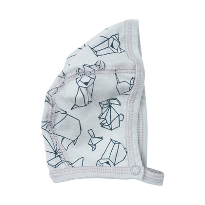 Vauvalakki suloisella eläinkuosilla. Nepparikiinnityksen avulla lakki pysyy hyvin vauvan päässä. 95% luomupuuvillaa, 5% elastaania