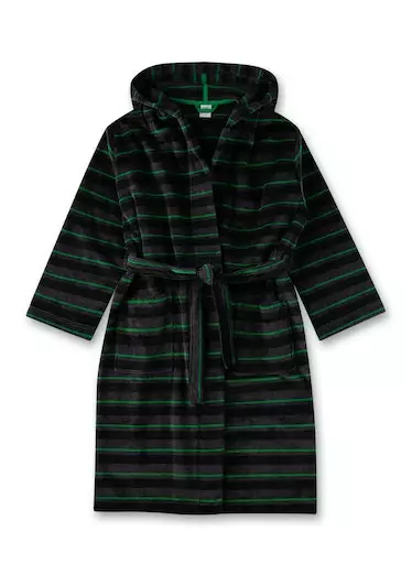 Sanetta lasten pehmeä hupullinen kylpytakki, jossa mustia, harmaita ja kirkkaan vihreitä raitoja.