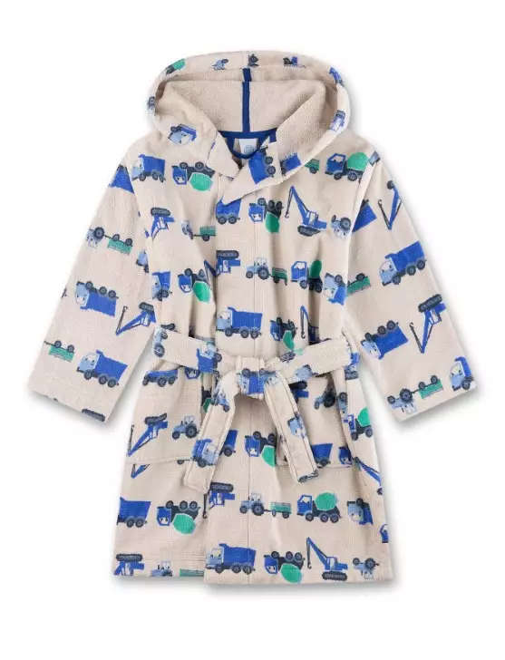 Sanetta lasten pehmeä hupullinen kylpytakki, jossa beigellä pohjalla traktorin, betoniauton ja kaivurin kuvia. Materiaali: 90% puuvillaa, 10% polyesteria