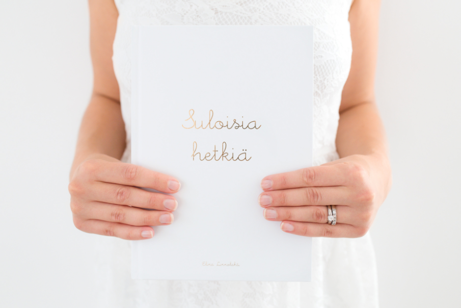 Nappaa kirja mukaan jo sairaalakassiin ja anna ensimmäisten vieraiden jättää siihen tervehdykset vastasyntyneelle vauvalle. Pidä kirjaa esillä lapsen tärkeissä hetkissä ja juhlissa kuten kastejuhlassa/ nimiäisissä ja syntymäpäivänä.