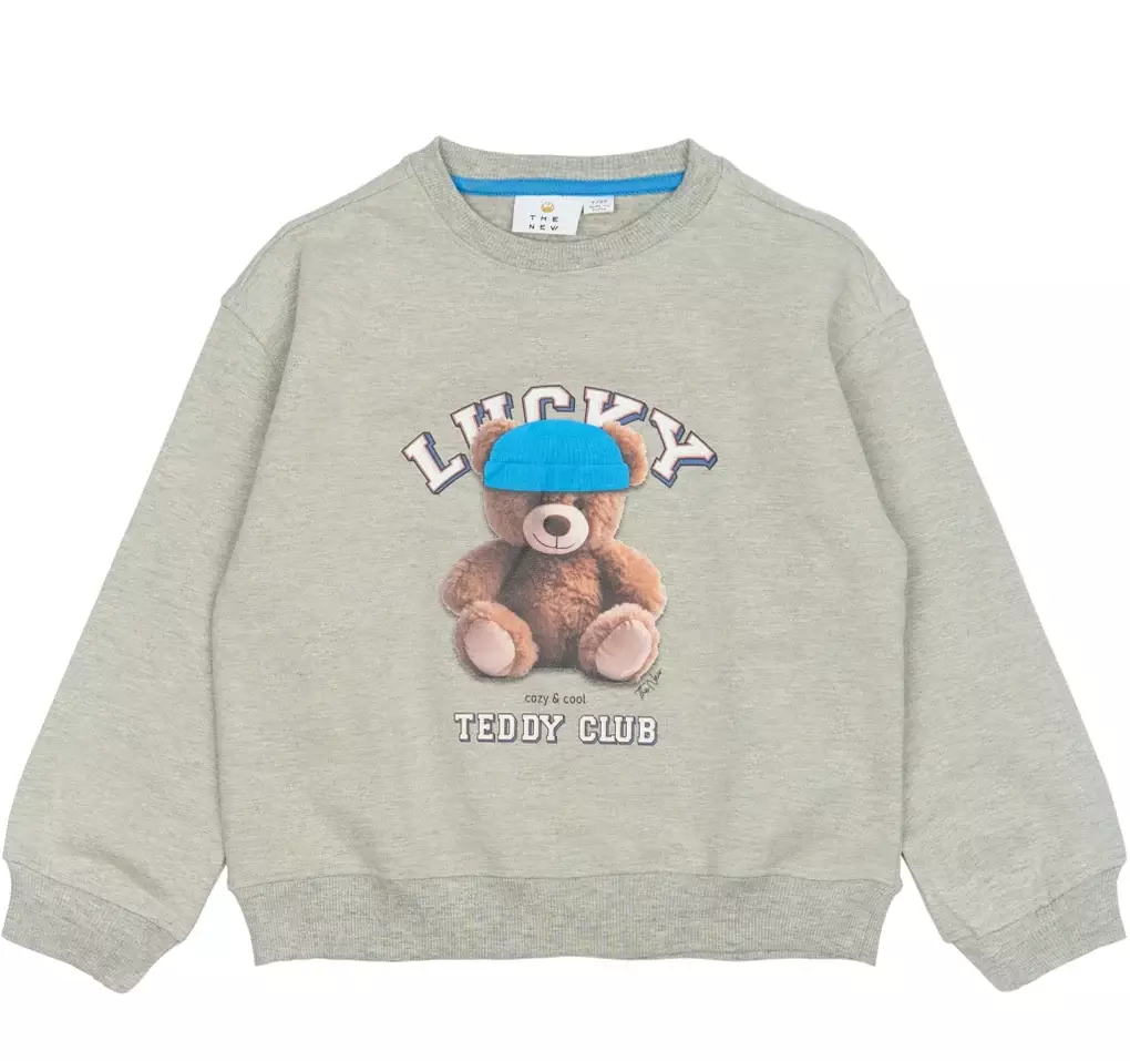 Lasten harmaa collegepaita jossa suloinen nalle painatus. 90% puuvillaa, 5% polyesteri, 5% elastaania