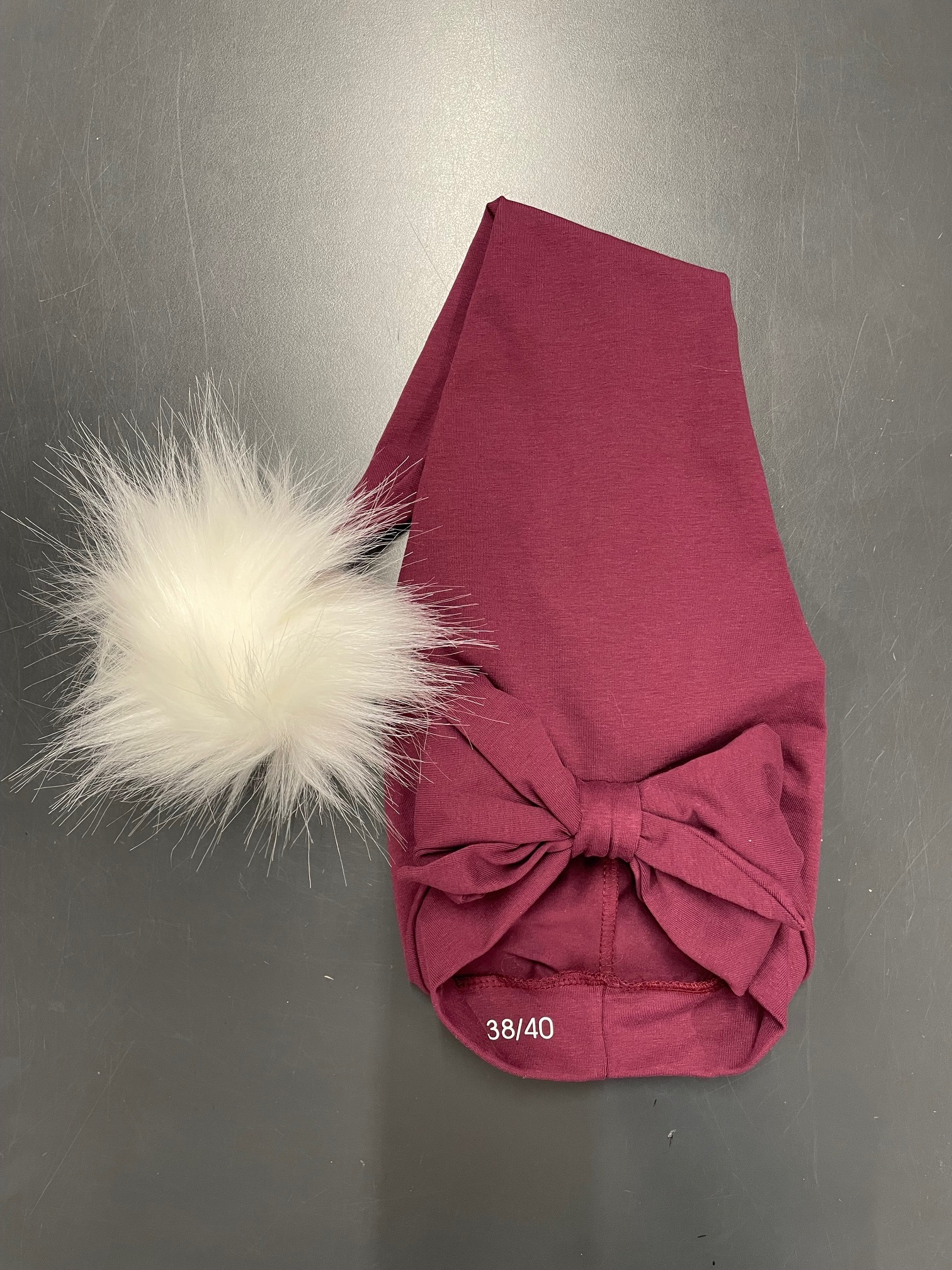 Uupana Designin trikoinen tonttulakki rusetilla. Tonttulakissa keinoturkistupsu ja takana valkoisella uupana painatus. Valmistettu Suomessa.