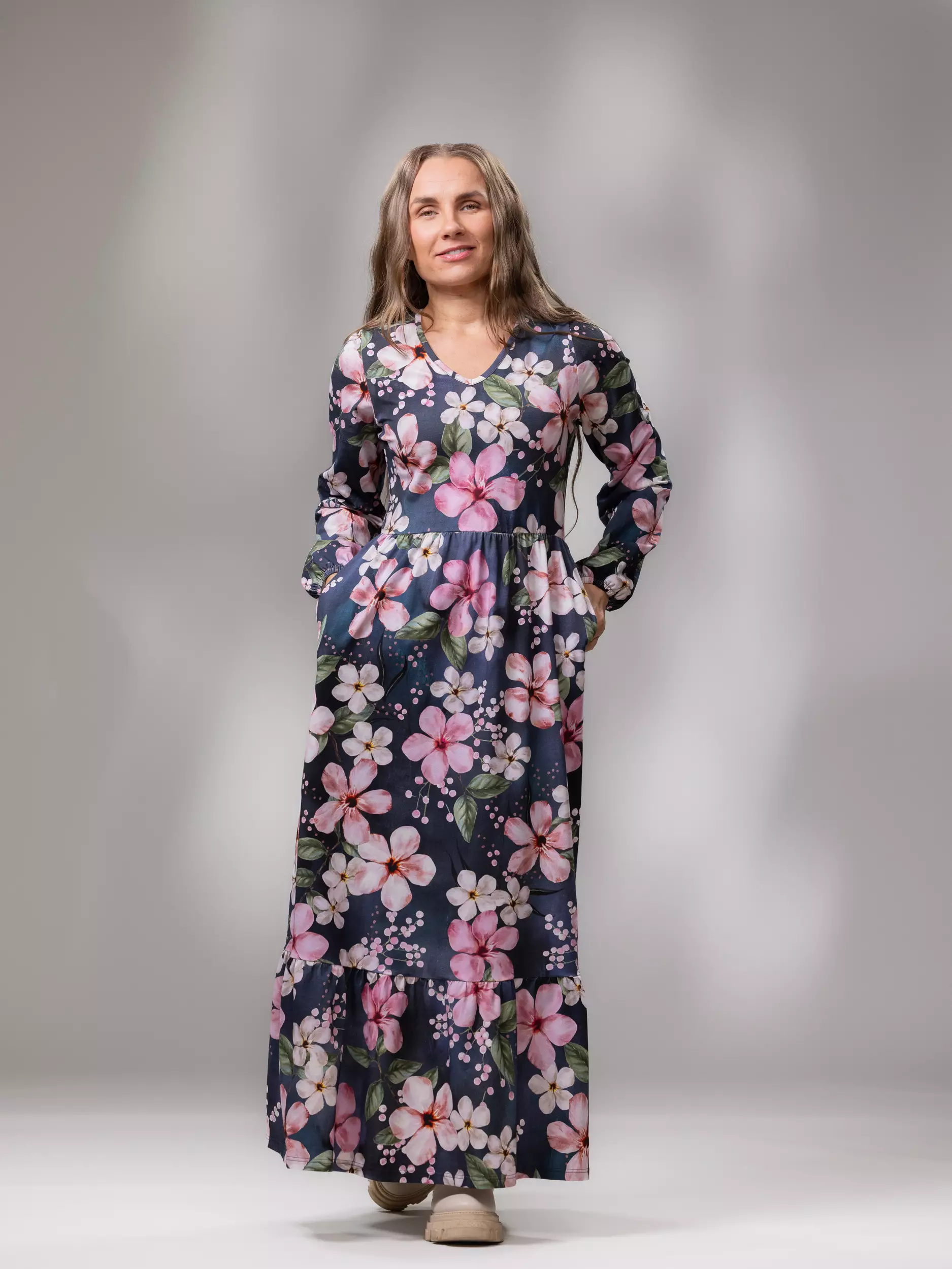 SELJAmekko on upea, frillahelmainen maksimekko. Tyylikäs v-pääntie ja näyttävä kuosi antavat mekolle naisellisen ja elegantin ilmeen. Vyötärösaumaan ommeltu kevyt kuminauha pitää istuvuuden ryhdikkäänä. Pitkät hihat poimuttuvat kauniisti hihansuissa kuminauhan avulla. Sivusaumoissa on taskut. Tämä nilkkapituinen, persoonallinen frillamekko on todellinen katseenvangitsija arkeen ja juhlaan!