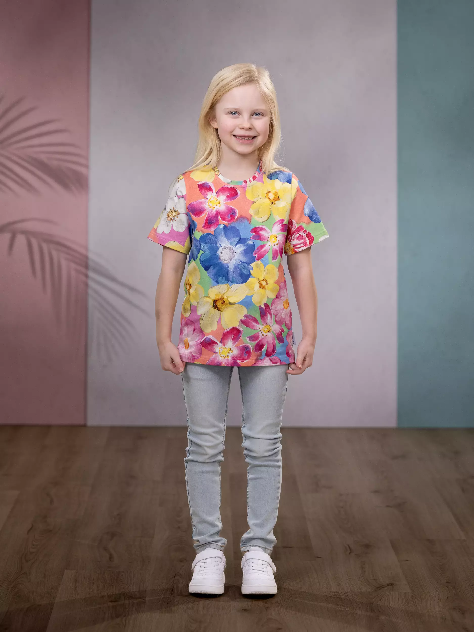 Ajaton lasten perus T-paita! Tämä trikoopaita on nimensä mukaisesti miellyttävän rento mitoitukseltaan. Hihat suojaavat paahteisella säällä käsivarsia ja helman pituus on suunniteltu niin, että paitaa on kesällä kiva käyttää shortsien lisäksi myös bikersien kanssa. Kylmemmillä säillä peruspaitaan on helppo yhdistää esimerkiksi housut, collarit, farkkutakki, collegetakki jne. Lyhythihainen pusero on mainio vaate kouluun, päiväkotiin ja kaikkiin arjen touhuihin.