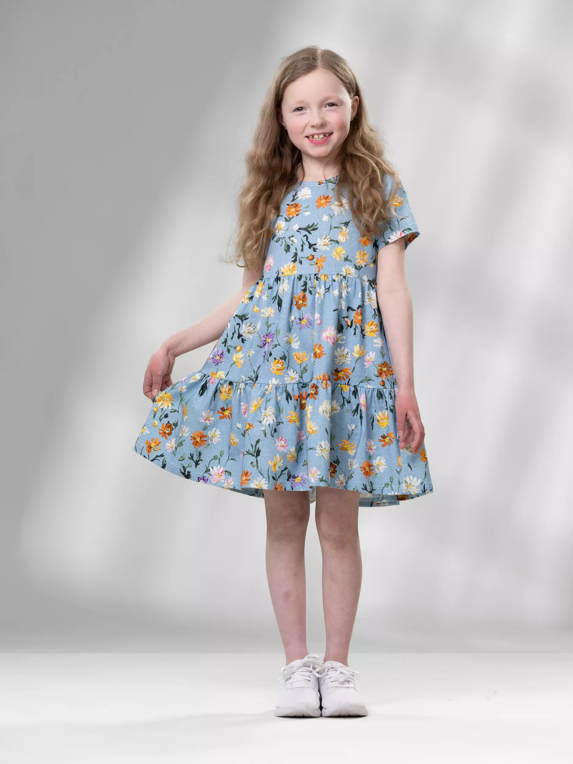 Kaunis, juhlavaankin käyttöön sopiva lyhythihainen mekko, jonka kerrostetussa helmassa on upeaa volyymia. Trikoo, 95% puuvilla/ 5% elastaani