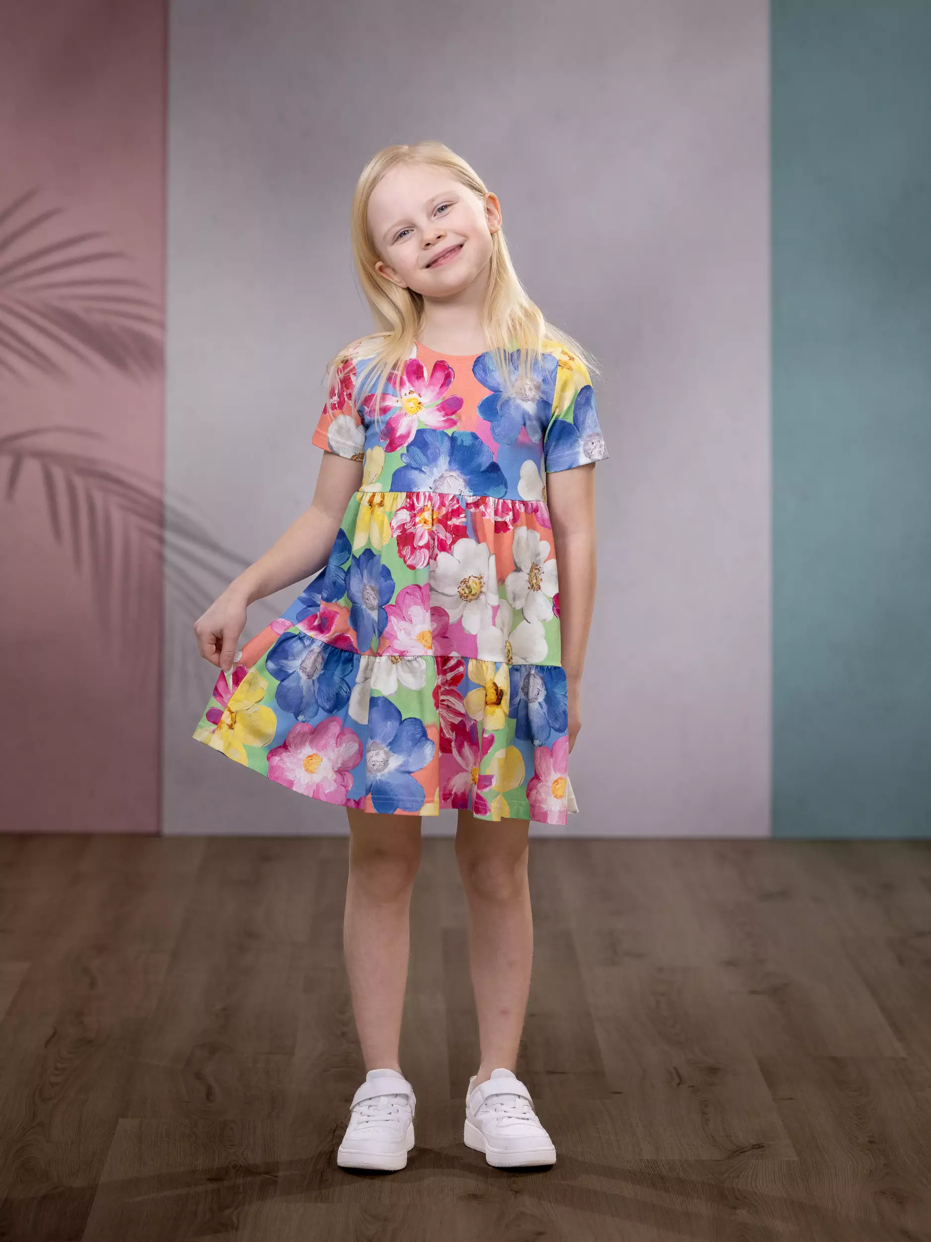 Kaunis, juhlavaankin käyttöön sopiva lyhythihainen mekko, jonka kerrostetussa helmassa on upeaa volyymia.