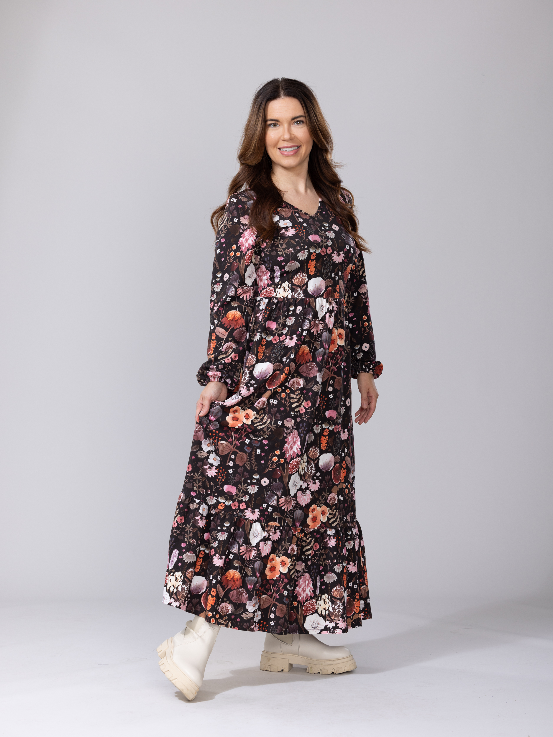 SELJAmekko on upea, frillahelmainen maksimekko. Tyylikäs v-pääntie ja näyttävä graafinen kuosi antavat mekolle naisellisen ja elegantin ilmeen. Vyötärösaumaan ommeltu kevyt kuminauha pitää istuvuuden ryhdikkäänä. Pitkät hihat poimuttuvat kauniisti hihansuissa kuminauhan avulla. Sivusaumoissa on taskut. Tämä nilkkapituinen, persoonallinen frillamekko on todellinen katseenvangitsija arkeen ja juhlaan!